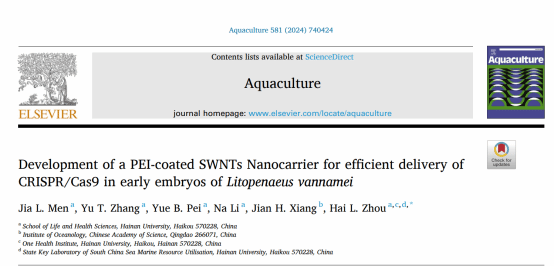 2024年2月25日,bevictor1946韦德官网与中国科公司海洋研究所联合在《Aquaculture》(JCR Q1,中国科公司1区Top期刊)上发表了题为“Development of a PEI-coated SWNTs Nanocarrier for efficient delivery of CRISPR/Cas9 in early embryos of Litopenaeus vannamei”的研究论文。