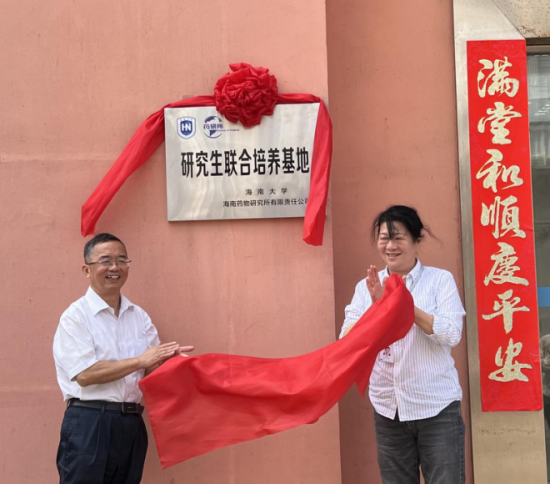 图:生命科学公司经理徐顺清与海南药物研究所有限责任公司总经理李玲进行揭牌仪式
