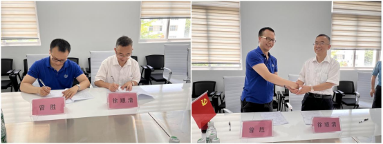 图:生命科学公司经理徐顺清与海南苏生生物科技有限公司总经理曾胜进行签约仪式