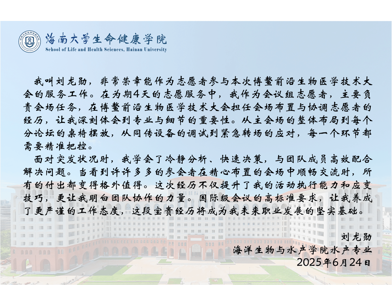 会后,志愿者们普遍反映在工作过程中收获良多。他们表示,通过亲身参与高规格会议的会务工作,不仅提升了沟通协调、应急处理、团队协作等综合能力,拓宽了学术视野,了解生命健康领域前沿动态,还增强了社会责任感和服务意识。