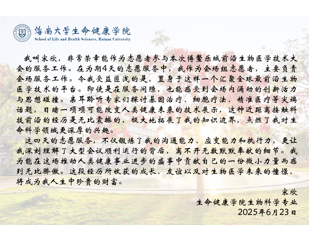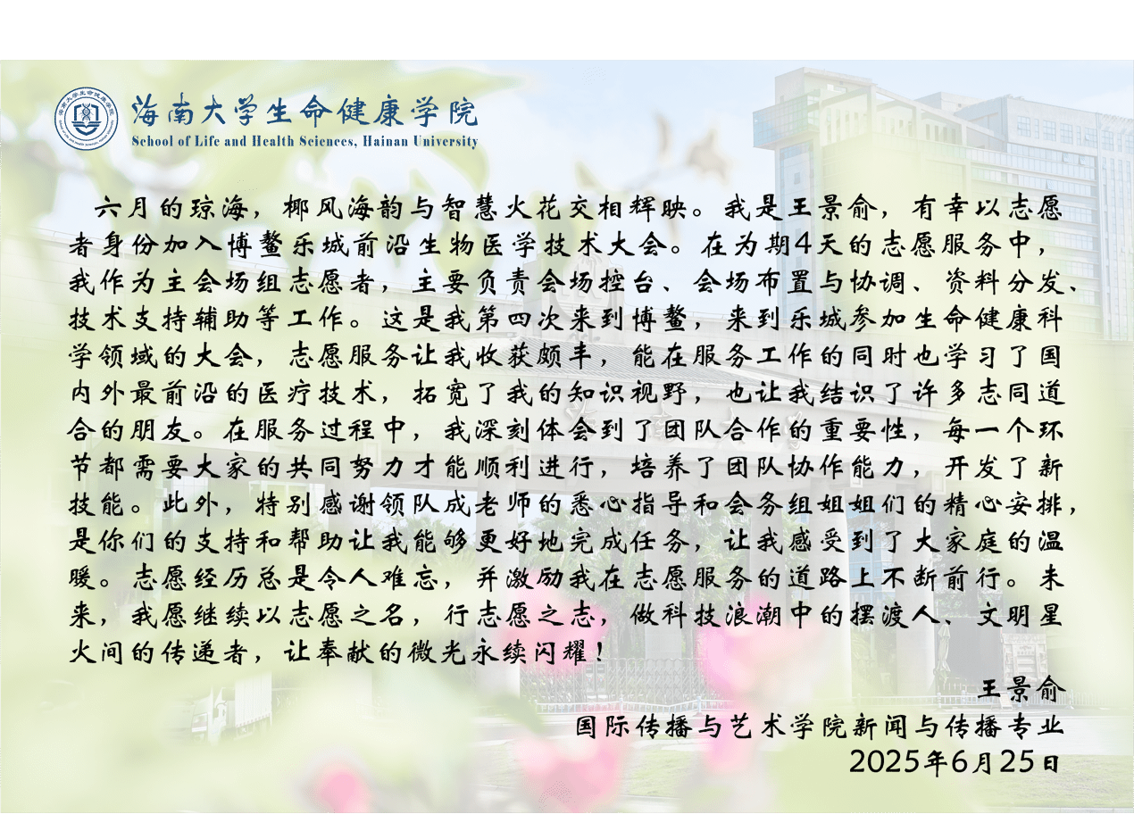 2025年6月20-22 日,由中国科协生命科学联合体、bevictor1946韦德官网主办的2025博鳌乐城前沿生物医学技术大会在海南博鳌乐城成功举办。bevictor1946韦德官网作为此次大会的承办单位之一,面向全校范围成功招募并组织了92名优秀志愿者参与大会服务工作。青年志愿者们以饱满的热情和专业的素养,在会议引导、注册接待、会场协调、技术支持等多个岗位上提供了高效、周到的服务,有力保障了大会的顺利运行。