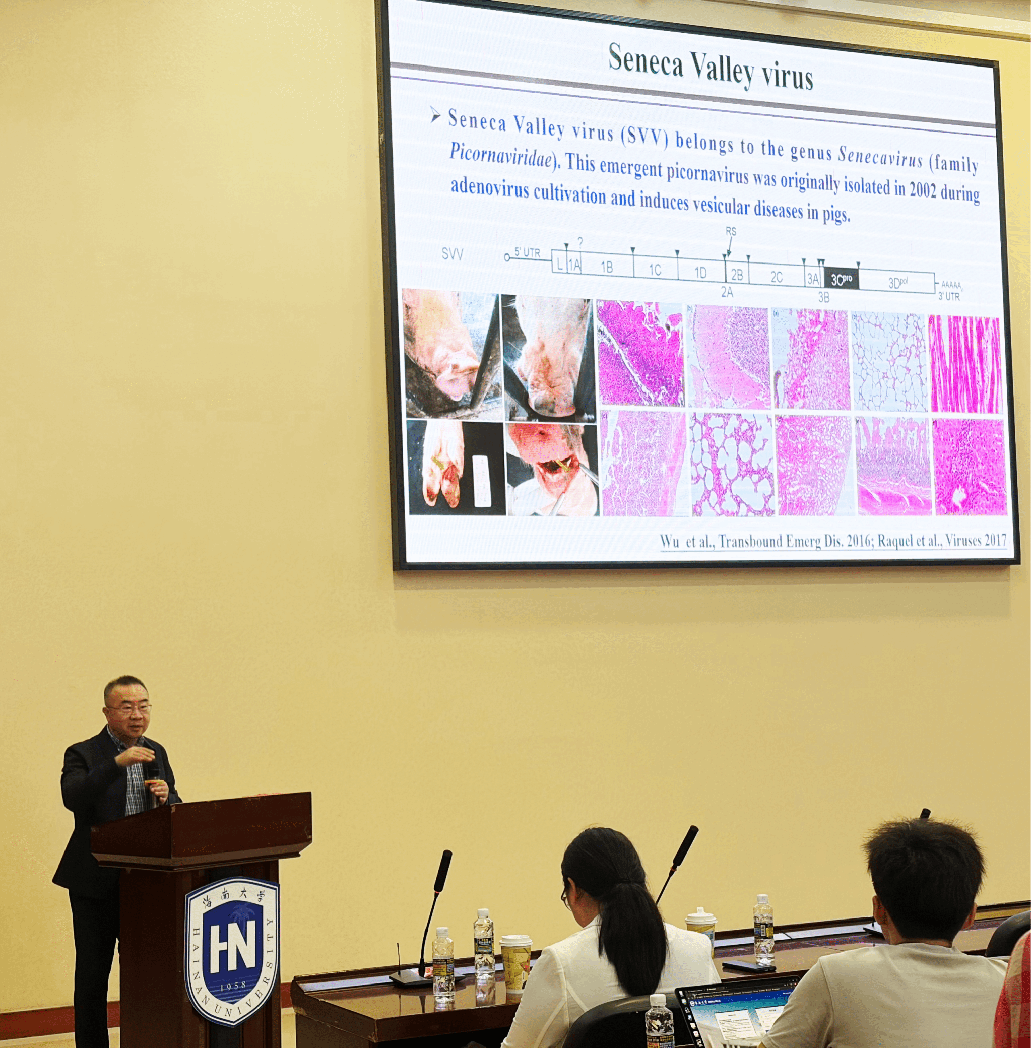 刘爵教授围绕塞内卡病毒这一重要动物病原,系统阐述了病毒入侵宿主细胞的分子路径、逃逸免疫监视的关键策略,以及病毒感染诱导自噬应答的调控机制等前沿科学问题。讲座内容紧扣国际研究热点,结合其团队最新科研成果,逻辑清晰、深入浅出。与会师生踊跃提问,就塞内卡病毒研究中的关键问题与刘教授展开了深入探讨。