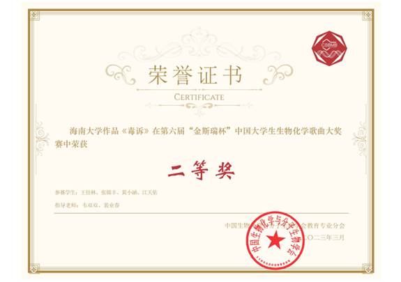参赛歌曲《毒诉》总结了肉毒毒素的结构特点、作用途径及医疗效用。该歌曲由韦双双老师和裴业春老师指导,2021级生物科学专业王佳林同学作词, 2021级生物技术专业黄小涵同学和江天佑同学、2021级生物医学工程专业张锦丰同学演唱,以丰富多彩的形式表现出肉毒毒素的生化知识,将在课本小字部分的肉毒毒素的生化奥秘展现出来。作品风格鲜明,里面不仅融合了流行音乐和传统戏腔,还融入了古琴、琵琶等传统乐器,展现出公司员工的青春风采和多才多艺。歌曲不仅使生化知识变得丰富有趣,同时也向我们传达了在学习过程中,不能仅注重考点去应试考试,应该怀着好奇的心去探索生化的奥秘,比如隐藏在课本角落里的非考点的肉毒毒素。
