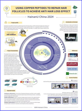 2024年HainanU-China iGEM团队聚焦当下“秃发&脱发”社会热点,参赛项目“GHK-Cu: Hair Expecto Patronum(超短肽:云鬓戍卫)”是利用合成生物学方法合成一种三肽超短肽——铜肽(GHK-Cu),以解决人们秃发脱发的困扰。项目开发了系列创新技术:通过建模找到一个适当强度的组成型启动子,在工程菌中利用串联重复方式表达铜肽。同时,开发了细菌种群数量关系的图像预测软件,利用群体感应技术构建可控的菌群生态系统,提升其生产效率。此外,团队自行设计研发了一种独特的微流控芯片,用于热力学稳定的铜肽涂层离子液体微乳液。还构建了一台光刻机,用于生产微流控芯片模具,能够在预算较低的情况下实现高精度微流控芯片的生产。