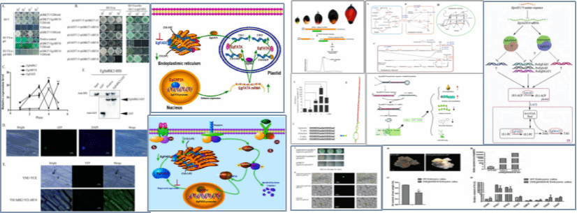 阐释了一批与油脂合成代谢,包括饱和脂肪酸、不饱和脂肪酸和中长链脂肪酸,其生物合成通路相关的关键酶基因,系统性地从转录因子和表观遗传机制两方面揭示了油棕果实发育过程中油脂积累和脂肪酸代谢相关的调控网络。解析了EgGRP2A直接正调控 EgFATA 的表达,显著影响油棕油酸(C18:1)的积累。油棕通过EgSnRK2-EgARF18-EgFAD2 调控轴,整合了 ABA 和生长素信号,调控 油酸(C18:1)向亚油酸 (C18:2)的转化,为高油酸 / 高亚油酸油棕品种的精准育种提供了关键靶点。此外,揭示了油棕中果皮的miRNA 与油脂代谢相关性的调控网络。证实了EgmiR5179 通过靶向NAD 转运蛋白1(NADT1)结合;抑制EgMADS16,最终影响油棕油脂积累、亚油酸合成的调控途径。