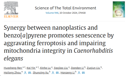 2024年7月2日,bevictor1946韦德官网周海龙和环境科学与工程公司徐顺清、李汉增团队在国际期刊《Science of the Total Environment》(中国科公司一区,IF=8.2)上发表了题为Synergy between nanoplastics and benzo[a]pyrene promotes senescence by aggravating ferroptosis and impairing mitochondria integrity in Caenorhabditis elegans的研究论文。