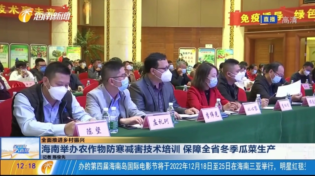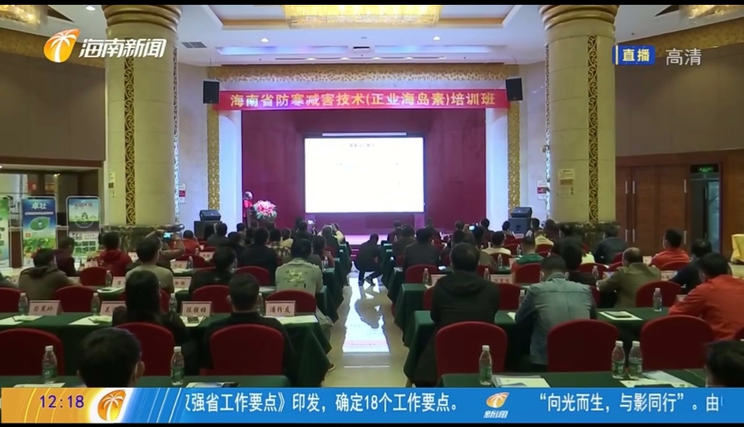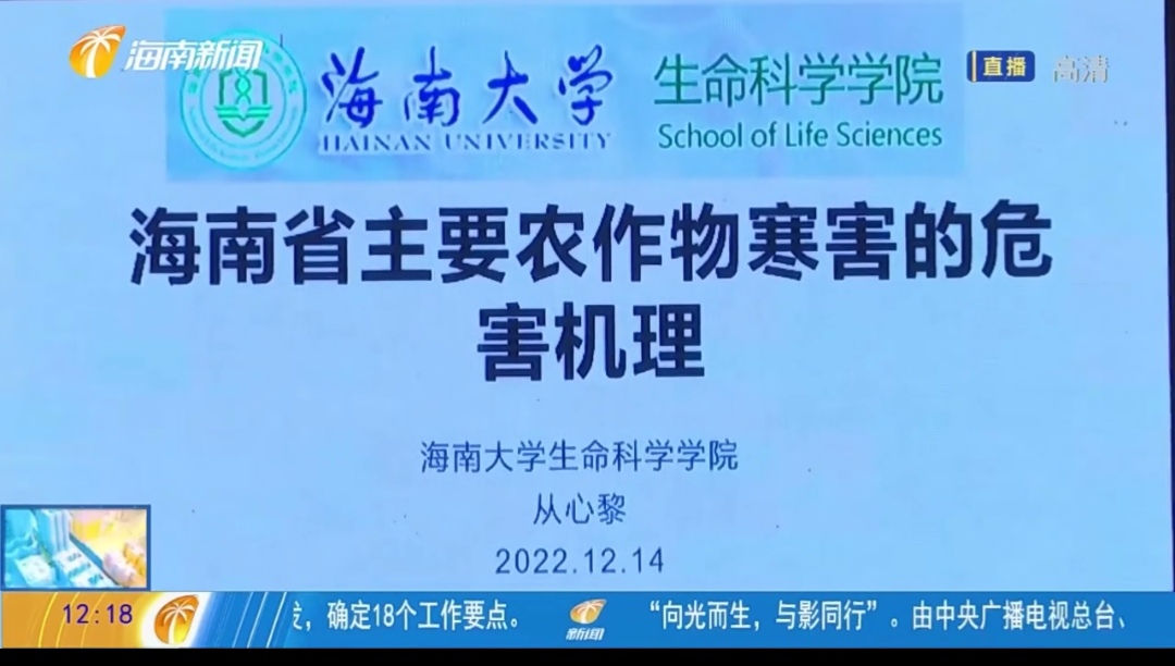 为落实省领导关于做好冬季农作物防寒指示批示精神,切实提高全省各级农业技术人员对低温减害的认识和处理能力,12月14-15日,海南省植物保护总站在海口康年皇冠花园酒店举办全省防寒减害培训班。生命科学公司从心黎副教授应邀为培训班开展了“海南省主要农作物寒害的危害机理”专题培训,深入浅出、图文并茂的专业讲授受到主办方、承办方和全体参训人员的广泛赞誉和一致好评。海南广播电视台“海南新闻”栏目予以专题报道。