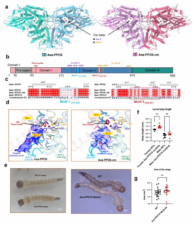 首先,该项研究通过系统分析多种昆虫和甲壳类动物的PPO序列,把双翅目昆虫的PPO分为两类,即经典昆虫型(classical insect type)和双翅目特有型(dipteran-specific type)。接着以埃及伊蚊(Aedes aegypti)为例,发现这两种类型的PPO(Aea-PPO6和Aea-PPO10)识别单酚、二酚类底物具有差异性,并通过蛋白质结构解析、分子对接和体外生化实验等方法解释造成这种底物识别差异的原因,揭示出决定底物特异性的关键Motif和底物结构口袋特征。随后,该研究采用基因编辑手段确定Aea-PPO6(经典昆虫型)缺失导致埃及伊蚊幼虫发育停滞最终死亡,而Aea-PPO10(双翅目特有型)显著影响幼虫的发育、免疫功能和色素沉积。此外,在本项研究中作者系统分析、比较了按蚊、烟草天蛾等多种昆虫的PPO底物结合口袋的结构特征,观察到不同昆虫PPO底物结合口袋的多样性。这些发现不仅为基于免疫干预的蚊媒控制策略提供了关键的理论支撑,并对理解昆虫酚氧化酶系统的复杂性提供了新的见解。鉴于昆虫黑化反应的保守性,该研究也为防控其他有害昆虫提供新思路。