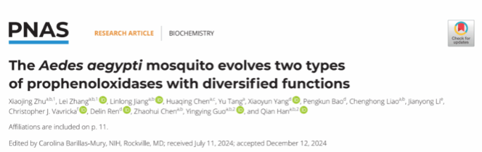 2025年1月14日,bevictor1946韦德官网病媒生物学团队在《Proceedings of the National Academy of Sciences of the United States of America》(PNAS)上发表了题为“The Aedes aegypti mosquito evolves two types of prophenoloxidases with diversified functions”的最新研究成果,系统分析了蚊虫免疫系统中关键黑化反应核心成员“酚氧化酶原”的功能分化及其底物识别机制。