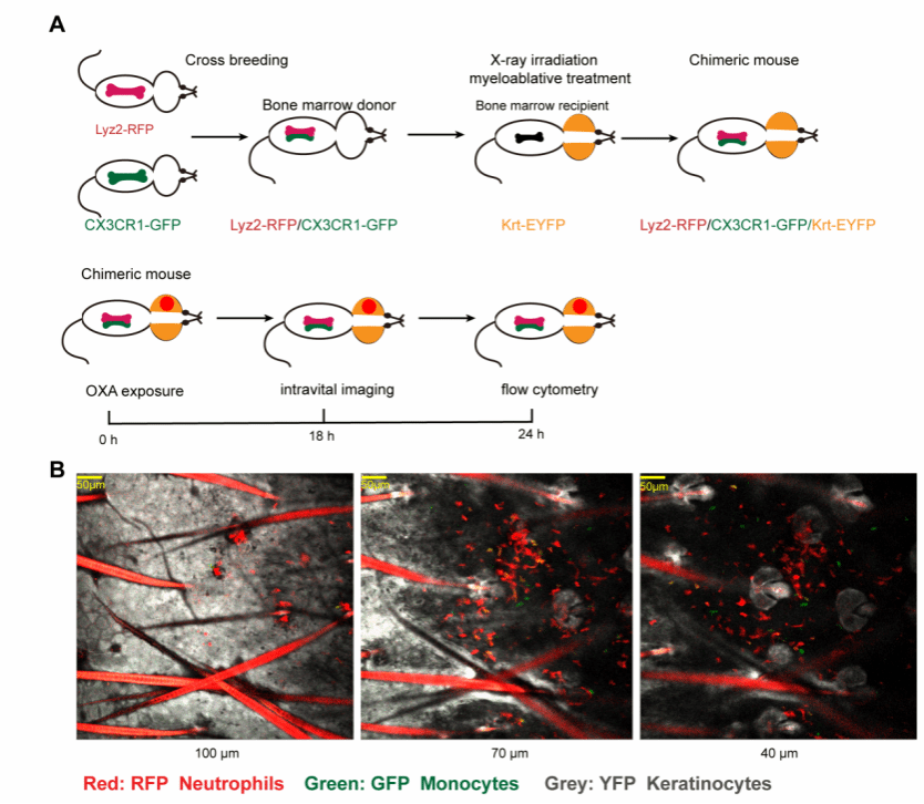 中性粒细胞的组织浸润如同一把双刃剑,其既可抵御病原体感染、帮助伤口修复,也可能介导炎症组织损伤加重,因此控制中性粒细胞的平衡稳态十分重要。中性粒细胞在表皮的过度积累和浸润是炎症性皮肤病的重要标志,可介导包括接触性皮炎(CD)、特应性皮炎(AD)及银屑病多种炎症性皮肤疾病恶化,严重影响病患者的生活品质。然而当前皮肤炎症微环境内中性粒细胞从真皮迁移浸润至表皮的时空动态规律还很不清楚,其跨表皮迁移的细胞和分子机制也很大程度上是未知的。因此,亟待发展可同时表征单核细胞、中性粒细胞和表皮角质细胞的活体可视化成像技术,在炎症微环境中实时动态捕捉单核细胞、中性粒细胞、角质细胞的动态互作过程。