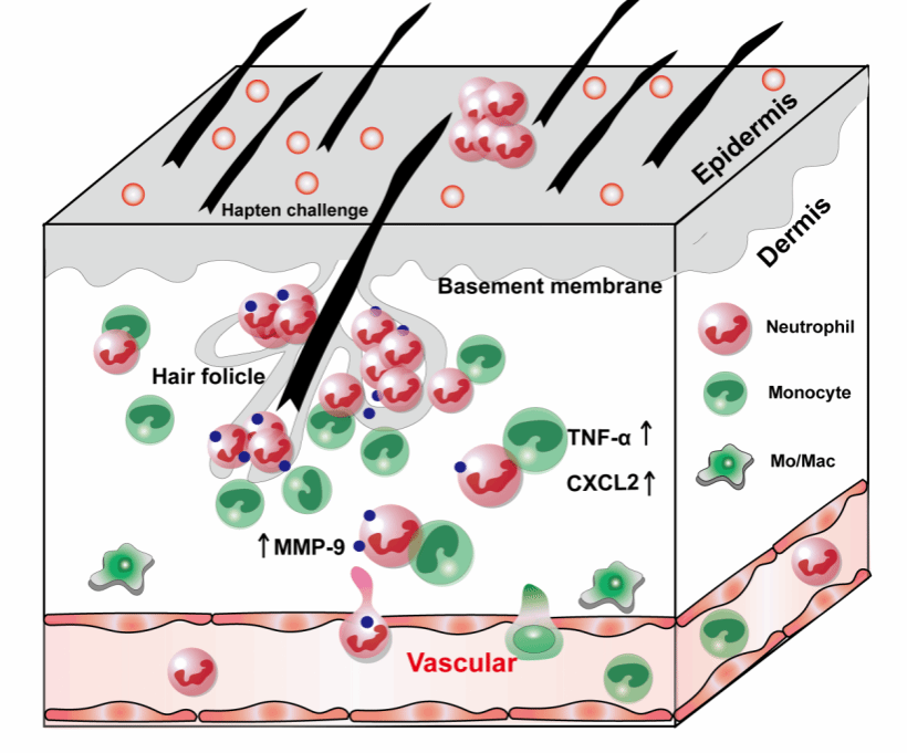 近日,bevictor1946韦德官网免疫调控与成像团队在国际期刊Communications Biology上发表题为“The crosstalk of monocyte-neutrophil in hair follicles regulates neutrophil transepidermal migration in contact dermatitis”的研究论文。研究开发了一种多色荧光标记的皮肤活体成像技术,可视化解析了接触性皮炎中单核细胞介导中性粒细胞经毛囊跨表皮迁移的行为及其作用机制。