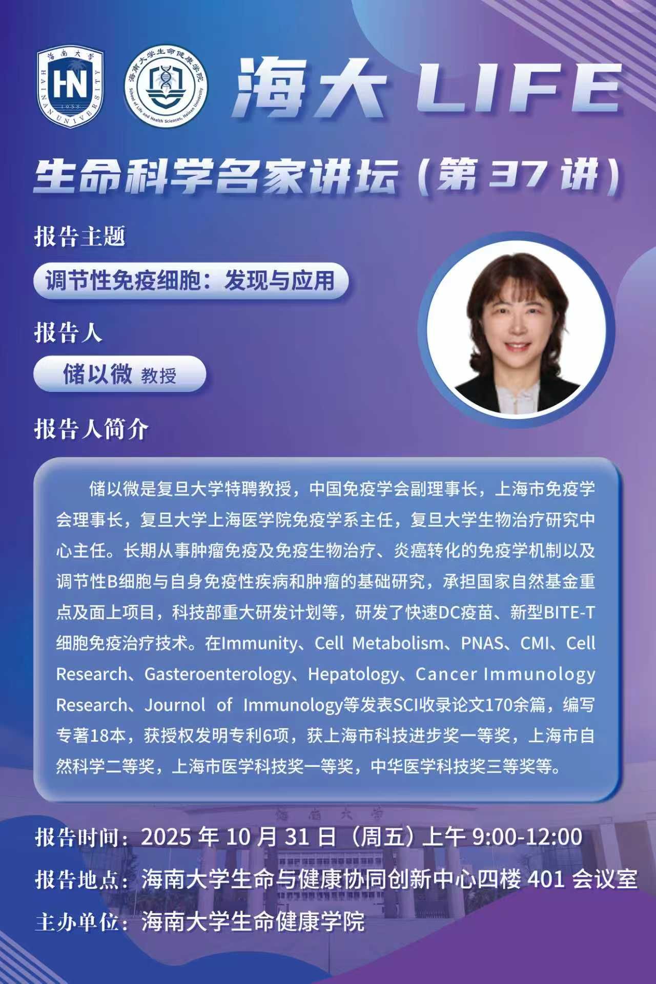 海大LIFE-生命科学名家讲坛(第37讲)| 储以微:调节性免疫细胞:发现与应用