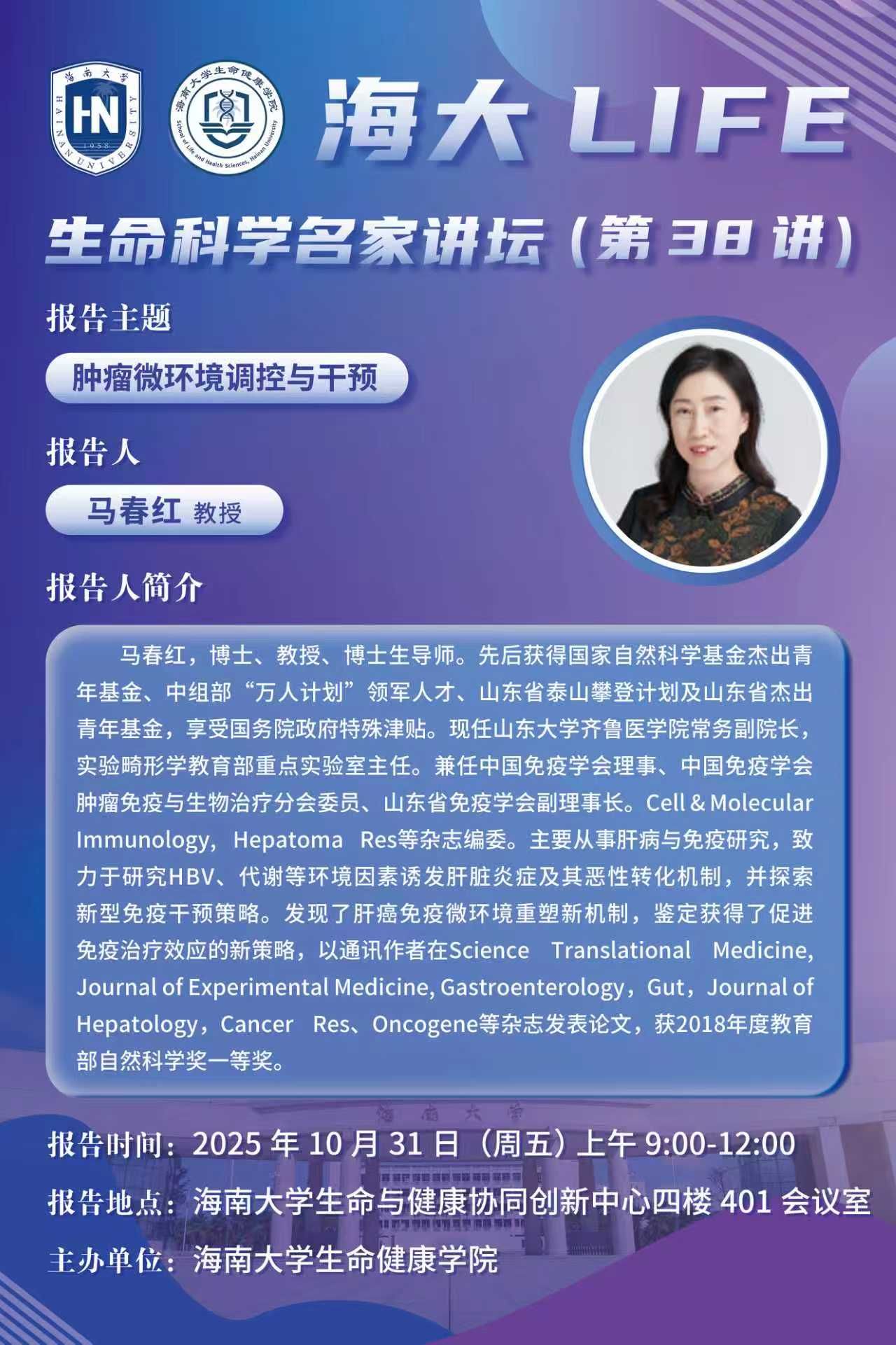 海大LIFE-生命科学名家讲坛(第38讲)| 马春红:肿瘤微环境调控与干预