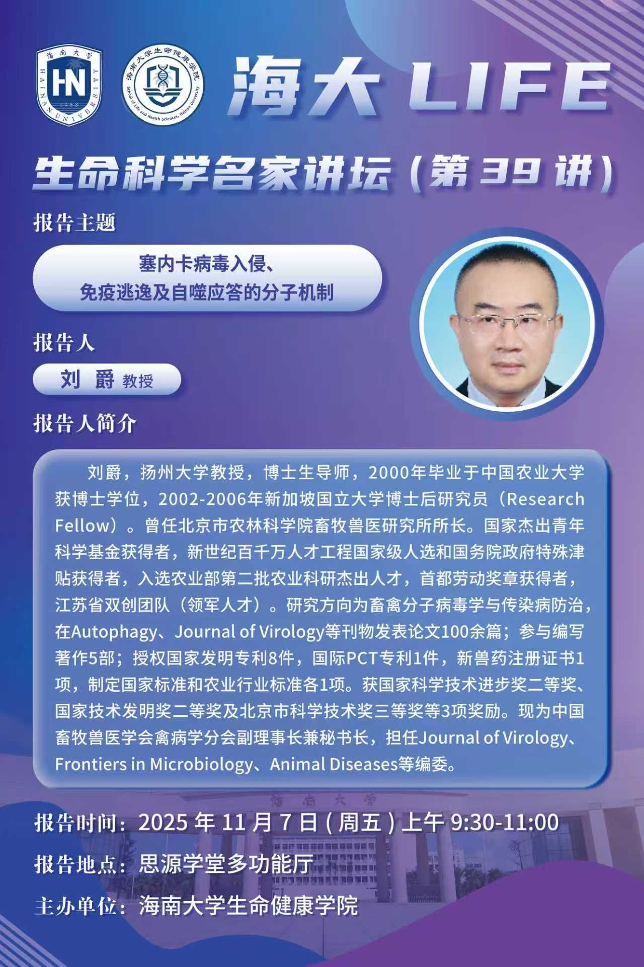 海大LIFE-生命科学名家讲坛(第39讲)| 刘爵:塞内卡病毒入侵、免疫逃逸及自噬应答的分子机制